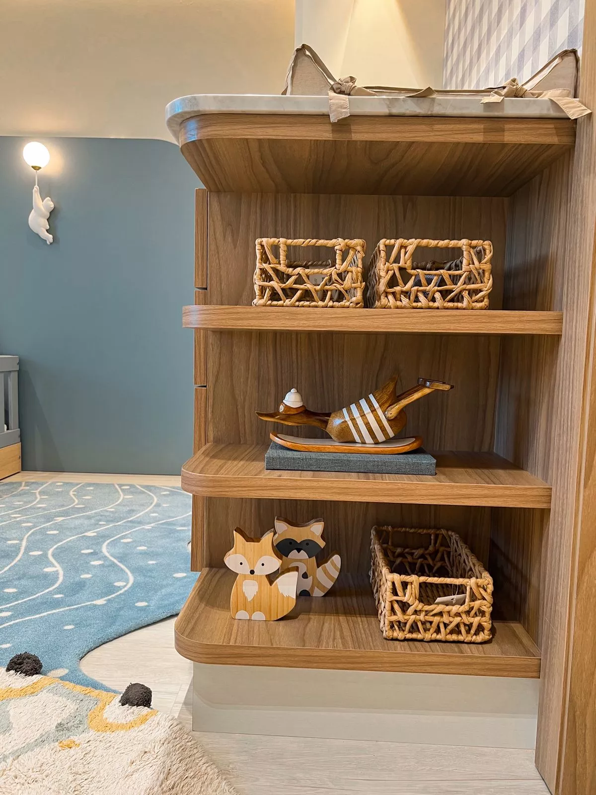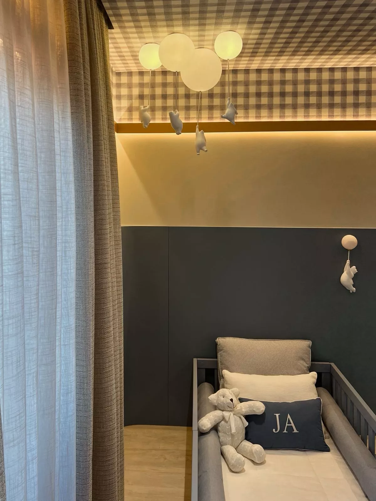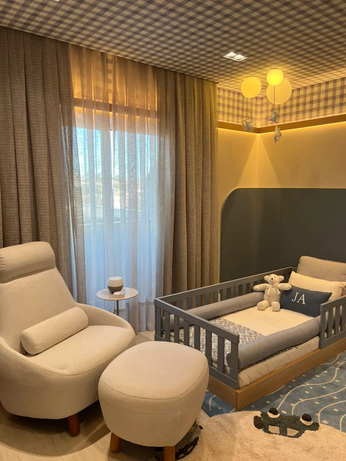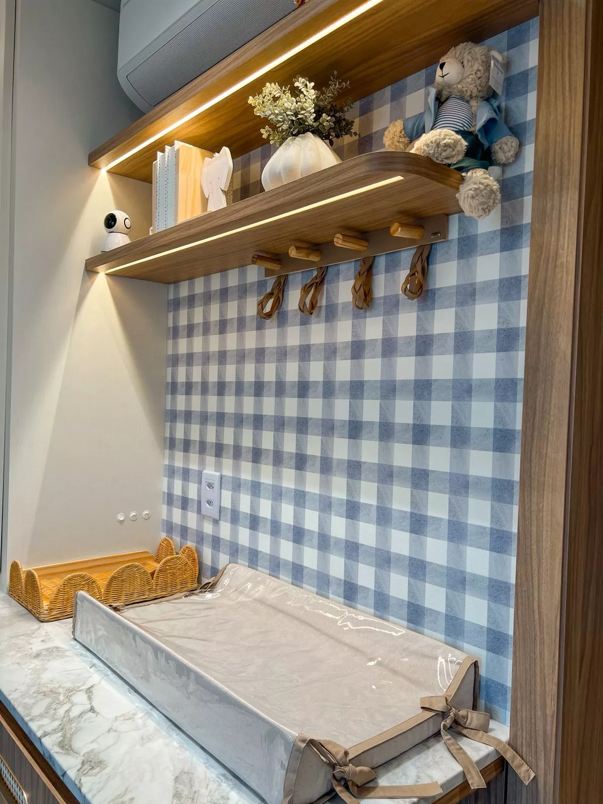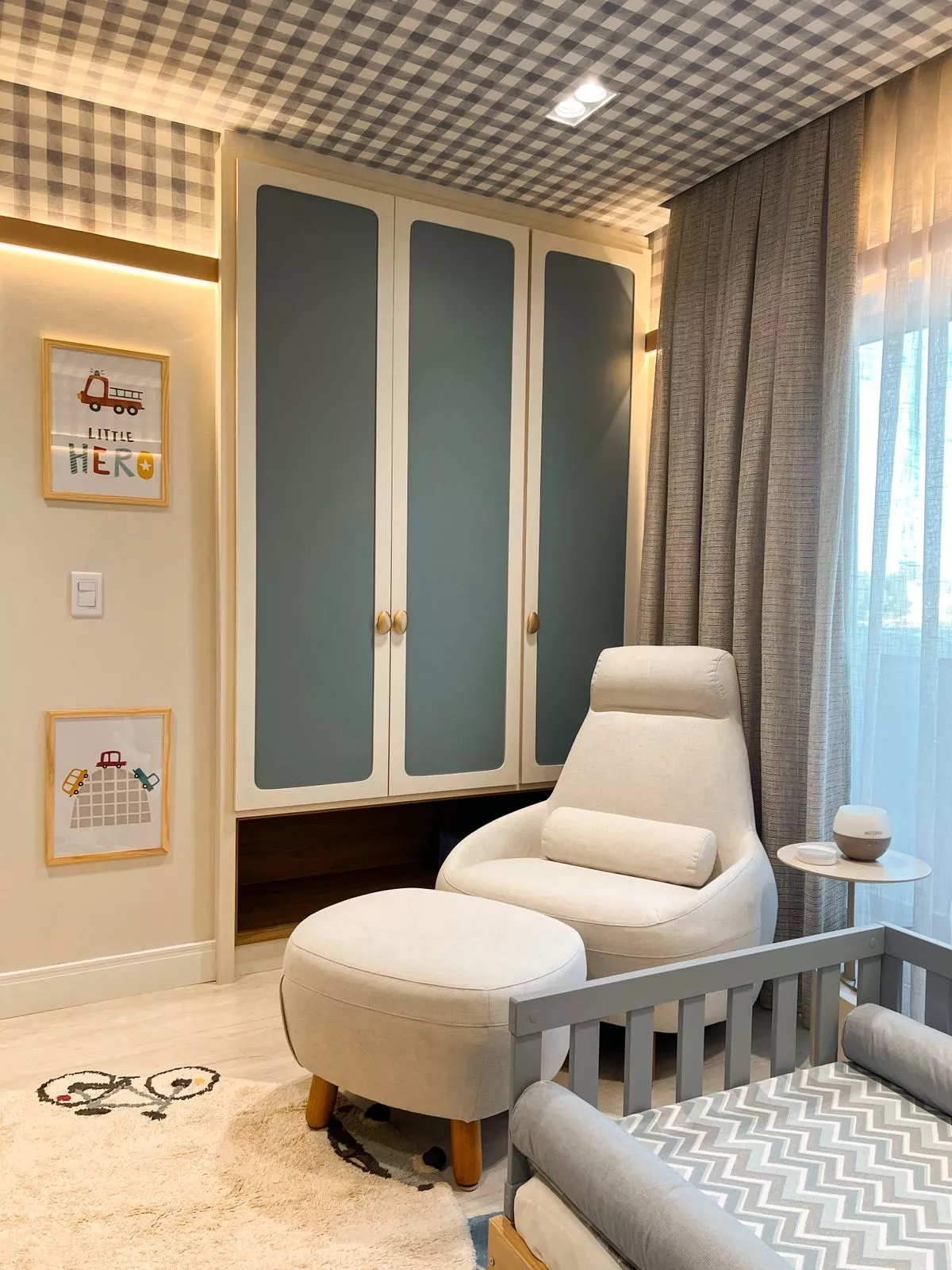 Neste projeto encantador, assinado pela arquiteta Thaina Horn, cada detalhe foi cuidadosamente pensado para acolher os primeiros momentos de um novo ciclo: a chegada de um bebê. Em tons suaves de azul, o ambiente transmite serenidade e doçura, com papel de parede xadrez que remete ao clássico atemporal. As cortinas, leves e envolventes, filtram a luz com delicadeza e criam uma atmosfera de tranquilidade. Elementos decorativos escolhidos com carinho aquecem o espaço e revelam o cuidado em cada escolha. Um quarto planejado para embalar sonhos, celebrar a vida e eternizar memórias desde o primeiro olhar.
