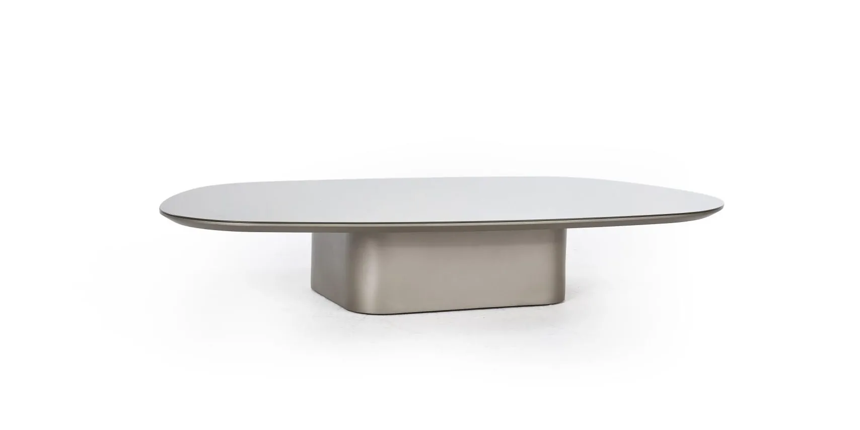 A Mesa Saturnia da Century impressiona com silhueta arredondada e presença imponente, proporcionando um visual marcante para ambientes que buscam equilíbrio e sofisticação.