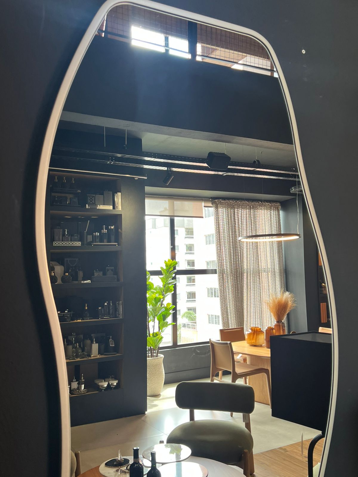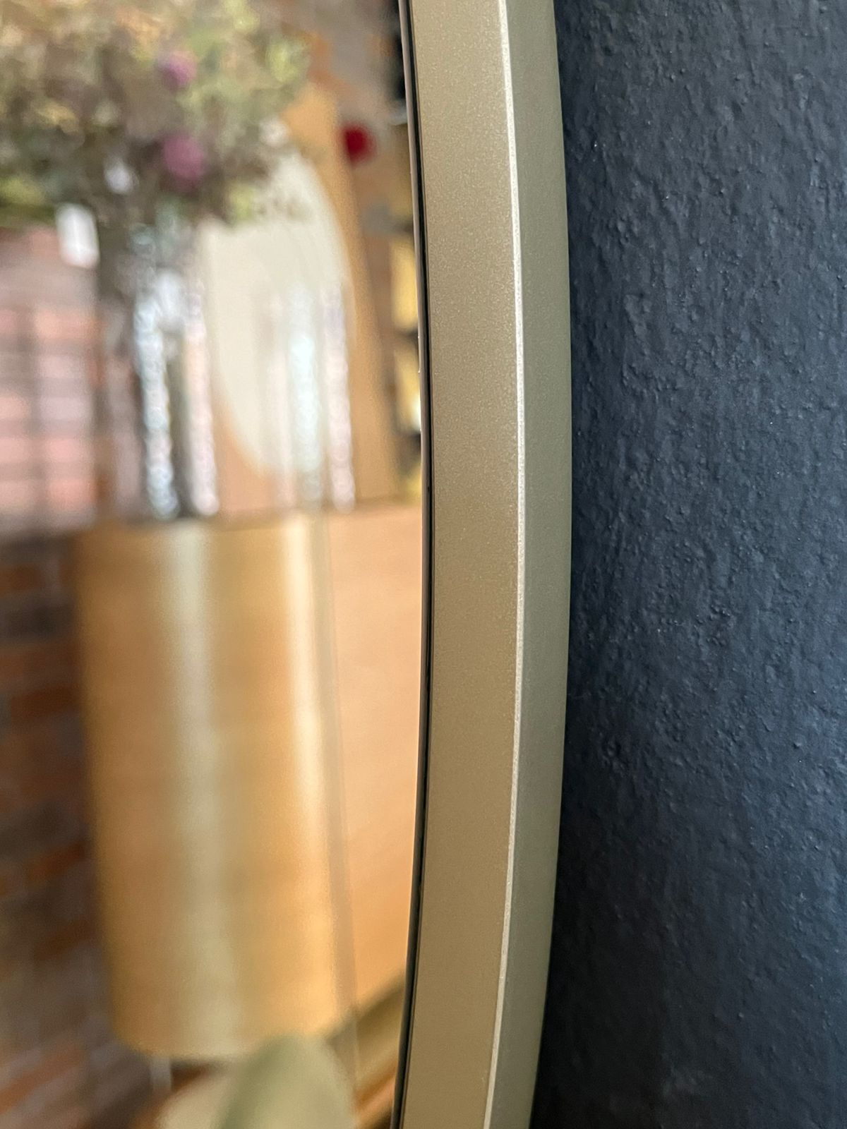 Espelho Luna da Zen Design em formato orgânico e altura ideal para corpo inteiro, com acabamento dourado fosco que traz elegância discreta e contemporânea. Uma peça imponente e versátil que amplia o ambiente, adiciona sofisticação e cria um ponto de destaque cheio de personalidade na decoração.180x771UN
